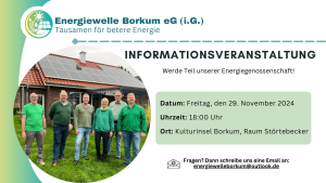Die zukünftige Energiegenossenschaft „Energiewelle Borkum“ lädt alle Interessierten herzlich zu einer Informationsveranstaltung am 29. November 2024 ein, um über die geplante Gründung zu informieren. Unter dem Motto „Tausamen för betere Energie“ setzt sich die Genossenschaft für eine nachhaltige Energieversorgung auf der Insel ein und bietet Bürgerinnen und Bürgern die Möglichkeit, gemeinsam in erneuerbare Energien zu investieren.