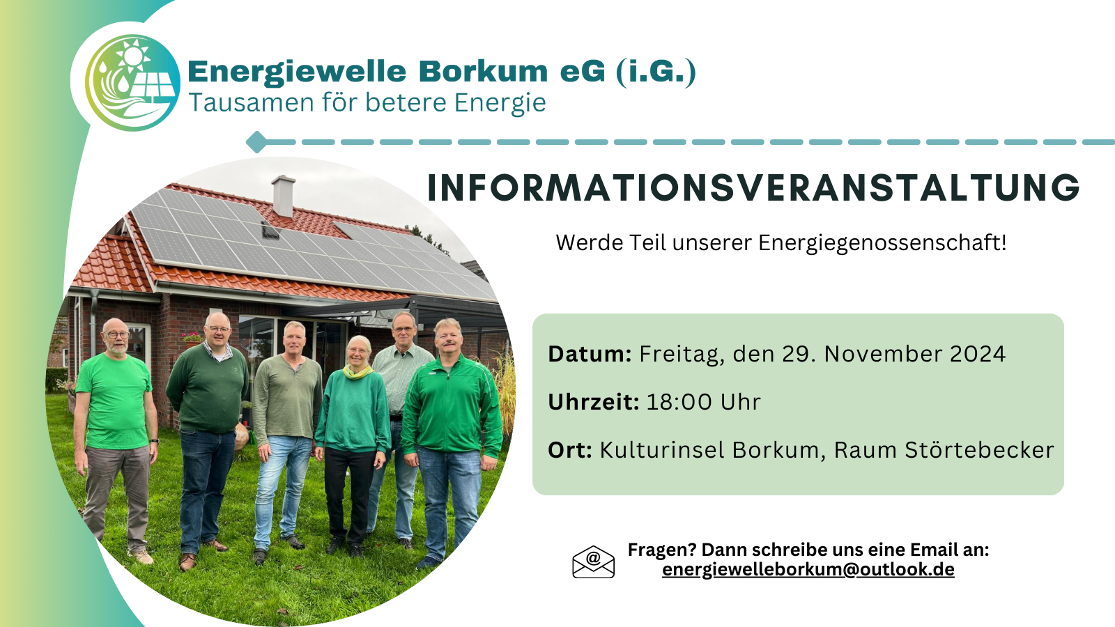 Falls Sie nicht teilnehmen können, aber trotzdem mehr wissen möchten, melden Sie sich gerne bei uns unter energiewelleborkum@outlook.de.